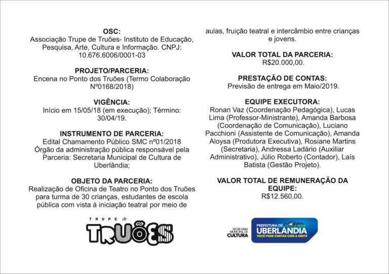 Atualmente a Trupe de Truões elabora e desenvolve seus projetos a partir de dois programas que regem as práticas do grupo.